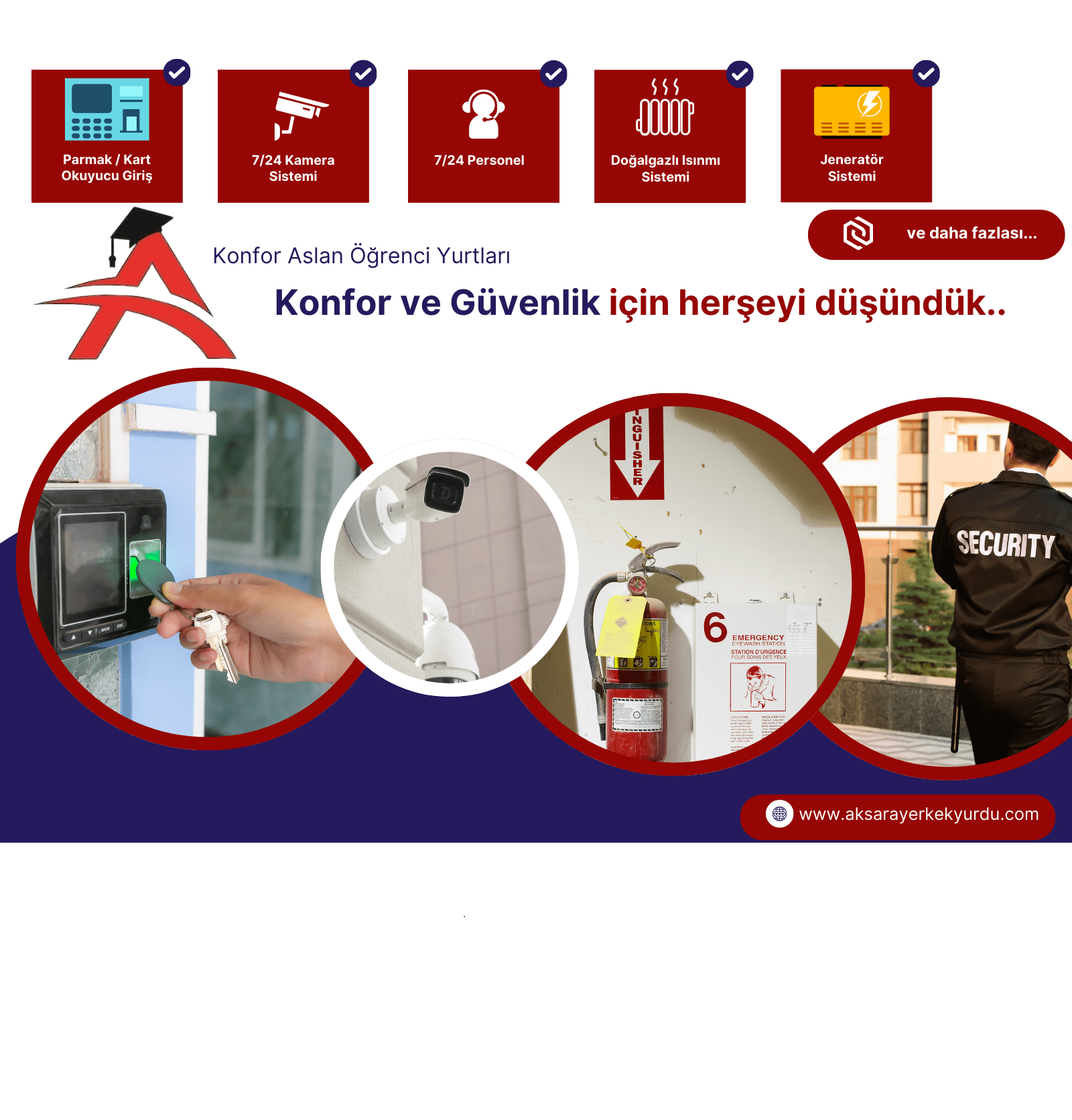 Konfor Aslan Erkek Öğrenci Yurtları 2005 yılında İzmir ilinde hizmete başlayıp 2012 yılından itibaren Aksaray ilinde hizmetine devam etmektedir. Bugüne dek binlerce sayıda öğrenciye hizmet vermenin mezun etmenin haklı gururunu yaşamaktayız. Yurdumuz 1,2,3 ve 4 kişilik odalardan oluşma..